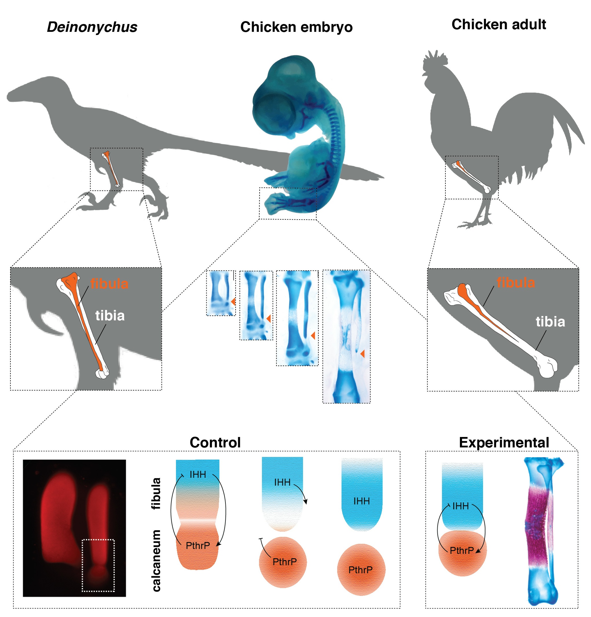 The fibula bone (orange) in Dinosaurs is as long as the tibia and reaches down to the ankle (upper left), whereas in adult birds, it is splinter-like and shorter than the tibia, missing its lower end (upper right). However, bird embryos actually start out like dinosaurs, and then develop their adult anatomy (center). The transformation can be stopped by experimental inhibition of Indian Hedgehog (IHH), a bone maturation gene, which leads to a bird with a dinosaur-like fibula (lower right)