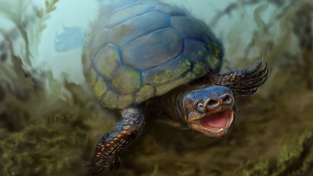 This undated illustration provided by the University of Utah shows a pig-snouted turtle that lived alongside tyrannosaurs and duck-billed dinosaurs. (Victor Leshyk / University of Utah via AP)